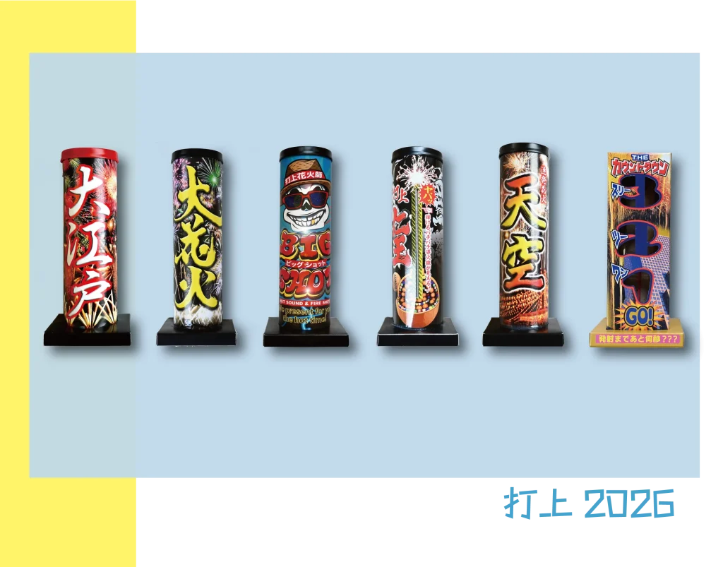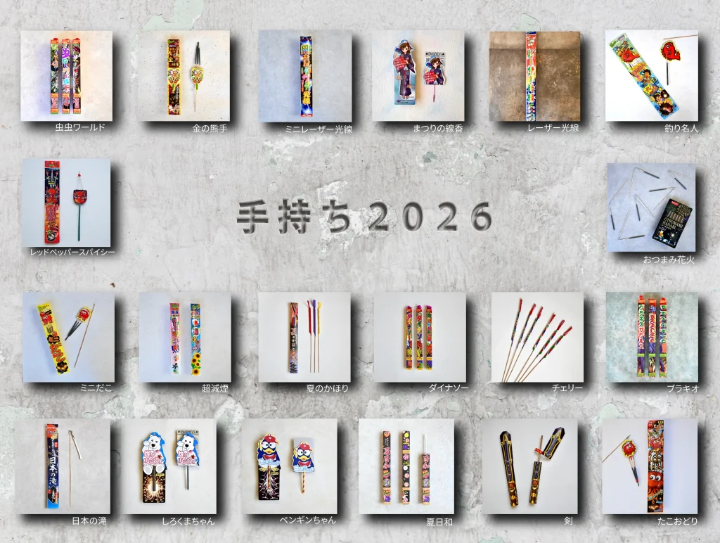 (左上から)虫むしワールド、金の熊手、ミニレーザー、まつりの線香、レーザー光線、釣り名人、レッドペッパースパイシー、おつまみ花火、ミニだこ、超減煙、夏のかほり、ダイナソー、チェリー、ブラキオ、日本の滝、しろくまちゃん、ぺんぎんちゃん、夏日和、剣、たこおどり